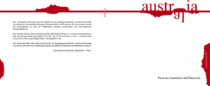 Austr(al)ia is a German-language limited edition anthology of short prose and short stories by five Australian writers and seven Austrian writers. Each contribution is accompanied by the respective author’s “take” on the short story form. The stories by the Australian writers were translated by the Austrian, Ka Ruhdorfer.
